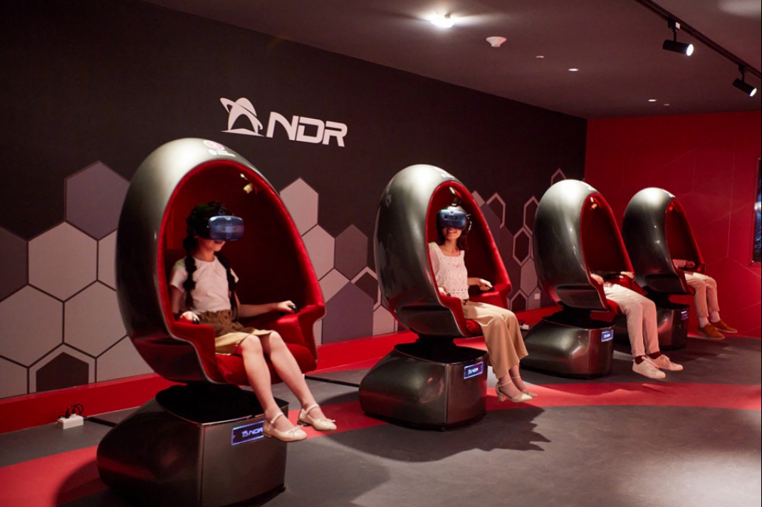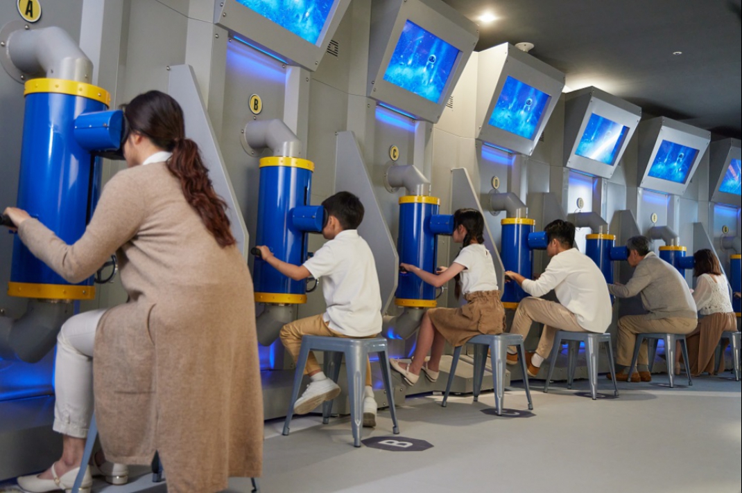 体験者は没入型パーソナルライドに座り、VRゴーグルを装着して水中探検の旅に出発します。