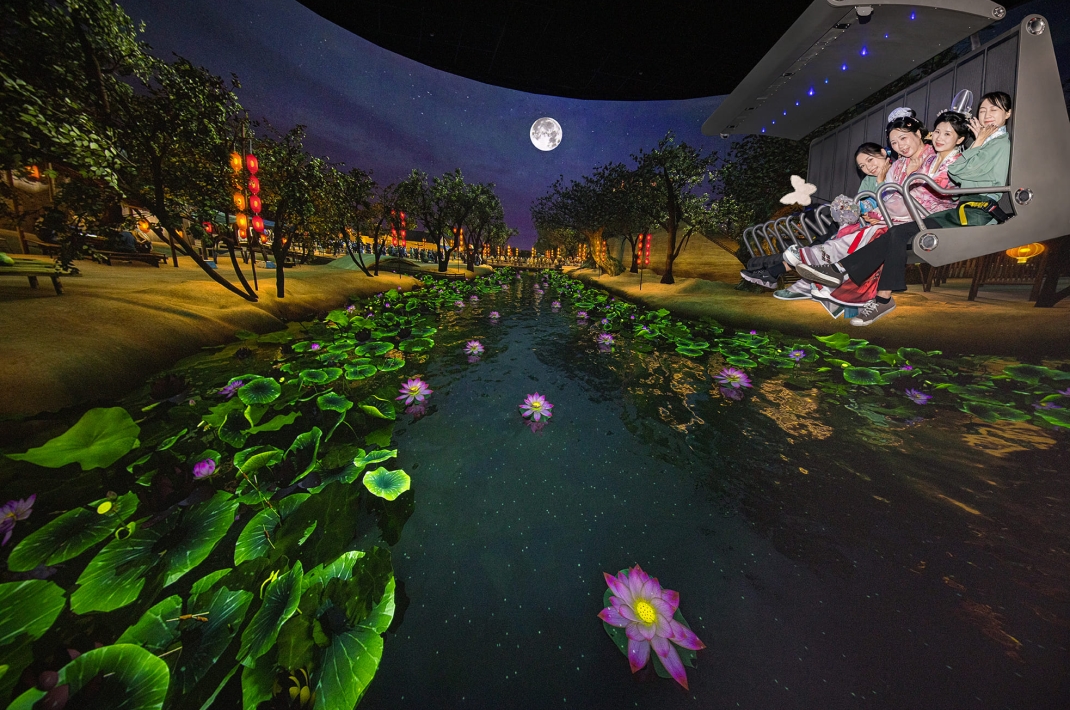 The adventure culminates with Brogent’s flying theatre experience, which features 120 seats, a monumental dome screen, multi-channel sound, and a suite of multisensory effects — including wind, scent, mist, vibration, and synchronized lighting that work together to create a fully immersive journey. Guided by the sound of the pipa, guests ascend to a flight platform 10 meters above the ground, and a spectacular 180-degree takeoff rotation launches them into breathtaking aerial views of Tang-era landscapes, architecture, and cultural scenes. From the vast Guíde Plateau and the ethereal beauty of Jiuzhai in Fly Over China, to the ancient walls of Yongning Gate, the lush Tang Paradise gardens, and the vibrant nighttime glow of the Great Tang All Day Mall, guests soar through time, experiencing the grandeur, vibrancy, and spirit of one of China’s most remarkable eras.