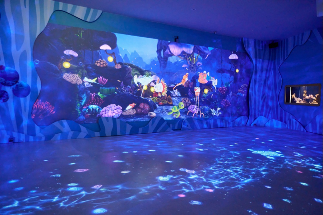 - 「潮水彩绘」:将孩子于画纸上挥洒对于海洋的创意想象跃然于投影墙面,提供亲子同乐的绘画互动空间